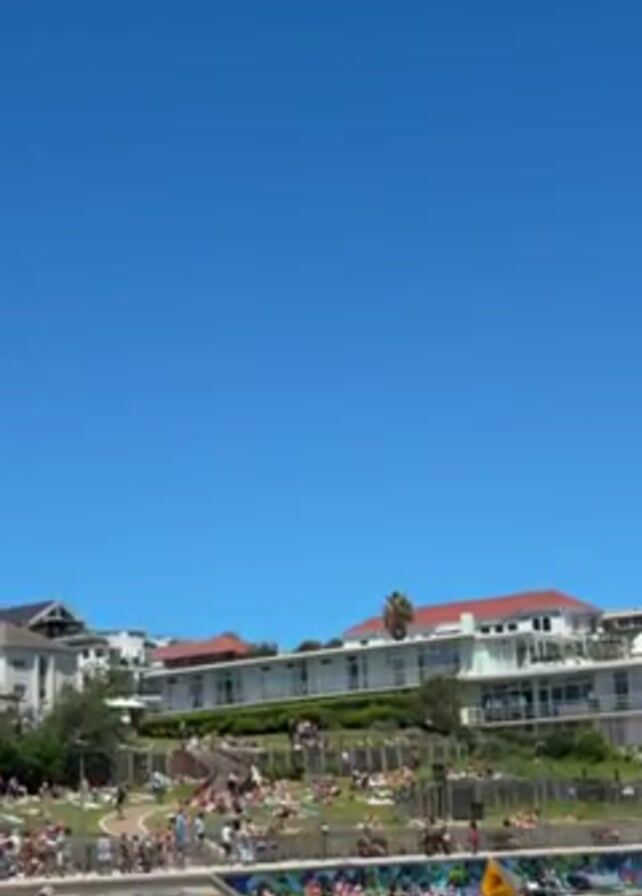 The video captures a beach scene on a sunny day under a clear blue sky. A crowd of people is visible on a grassy area and on the beach. Some are sunbathing, while others are walking around. Buildings are visible in the background, including some with red tile roofs. There is also a yellow warning sign near the beach. The tide appears to be out, with some seaweed or algae visible on the sand in the foreground.