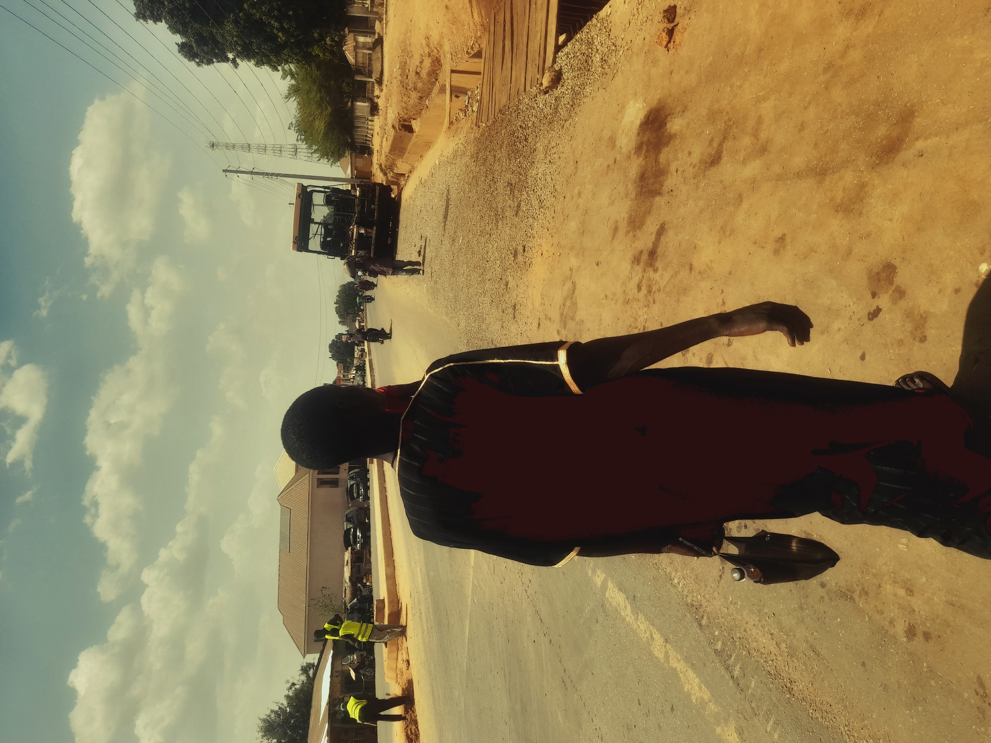 An outdoor, eye-level image captures a street scene in Ube, Nigeria, under a partly cloudy sky. In the immediate foreground, the back of a person wearing a dark top with reddish undertones and yellow trim is visible, holding a small dark bag containing a clear bottle in their right hand. They stand on a dry, light brown dirt shoulder, facing away from the camera. To the left, a paved road surface with a faint white line transitions into a construction area. Two individuals in yellow high-visibility vests are present on the left side: one is bent over, actively working with dirt, while the other stands upright nearby. Behind them, several parked vehicles, including dark cars and motorcycles, are visible near single-story and two-story buildings, one with a light brown corrugated metal roof. On the right side of the frame, a wide, unpaved, light brown dirt shoulder runs parallel to the paved road. Further down this shoulder, a large black and yellow construction vehicle, resembling a road roller, is positioned. Another person is visible walking towards this vehicle, carrying an object on their head. Adjacent to the dirt shoulder on the far right, an open ditch with wooden planks partially covering it indicates ongoing infrastructure work. A utility pole with multiple overhead lines extends diagonally across the mid-right. In the far background, additional buildings, trees, and a tall lattice utility tower are discernible. Several motorcycles and pedestrians are also visible further down the main road. The overall scene suggests ongoing construction or road maintenance in a moderately developed urban or semi-urban environment.