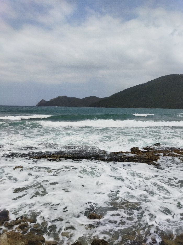 A rocky shoreline meets a turbulent sea under an overcast sky. Waves crash against the rocks, creating foamy white patterns. Beyond the waves, the teal-colored ocean stretches towards a hilly landscape dotted with dark green vegetation. The horizon is softened by the cloudy, gray sky.