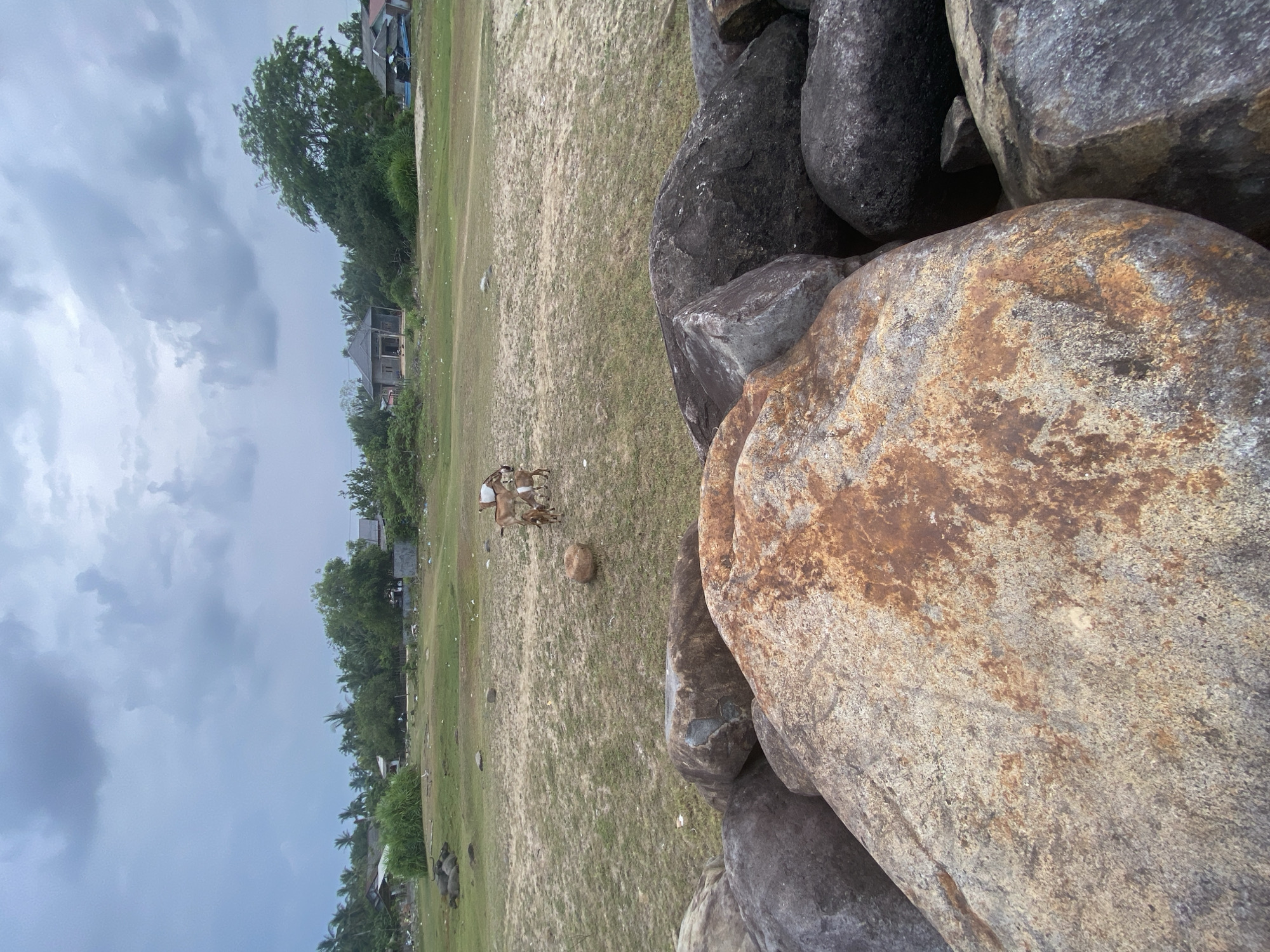 The image displays an outdoor scene in Idi Rayeuk, Indonesia, under an overcast sky. The foreground is dominated by a pile of large, irregularly shaped boulders exhibiting varied textures and colors, ranging from dark grey to rust-brown and light tan. Beyond these rocks, the midground presents a flat expanse of ground with sparse green vegetation, patches of dry grass, and exposed sandy areas. In the central midground, a group of three domestic goats is visible: one larger, light brown and white adult goat stands with two smaller, primarily brown goats nearby. Further to the left in the midground, several dark, robust animals, consistent with water buffaloes, are lying on the ground. A distinct, spherical brown rock is situated centrally on the ground. The background consists of a dense line of tropical foliage, including palm trees and other broadleaf trees. Partially visible within and behind this vegetation are several simple structures, one featuring a prominent grey, sloped roof. To the far right, near the tree line, two small blue boats are discernible. The sky above is heavily clouded with extensive grey cloud formations, indicating an overcast condition. No human subjects are present in the frame.