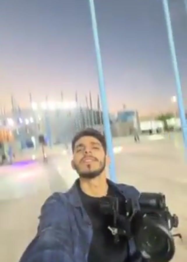 A young man with a beard is holding a camera with a gimbal in an open public space. He is wearing a black t-shirt and a blue plaid shirt. Behind him are many flag poles topped with white flags, a modern building, and a paved area with blue lines. He appears to be recording himself. The lighting suggests it is either sunrise or sunset.