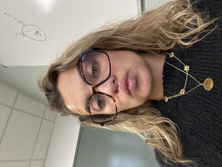 A female subject is depicted in a close-up selfie, facing the camera with a direct gaze and pursed lips. She has wavy blonde hair and wears large, square, tortoiseshell-patterned glasses with a blue light reflection visible on the right lens. Her attire includes a black textured sweater. She is adorned with two gold-colored necklaces: one featuring multiple small flower-shaped elements and another with an oval pendant depicting a raised relief. A gold-colored earring is partially visible on her left side. The background features a light green wall on the left, a white ceiling with grid-patterned tiles overhead, and a white whiteboard on the right. The whiteboard displays a simple, hand-drawn circular sketch with small markings and the diagonally written text "CHIC UT". The scene is set indoors, within the city of Saint-Étienne, France.