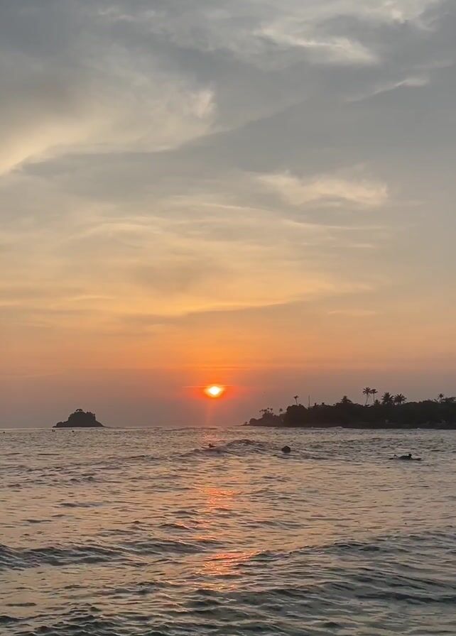 seascape at sunset. The sun, a bright orange orb, is setting on the horizon, its reflection stretching across the rippling water. Two small, rocky islands are visible in the distance. The sky is a mix of gray and orange hues, with wispy clouds scattered across it. There are several people in the water, some appear to be swimming and others on surfboards.
