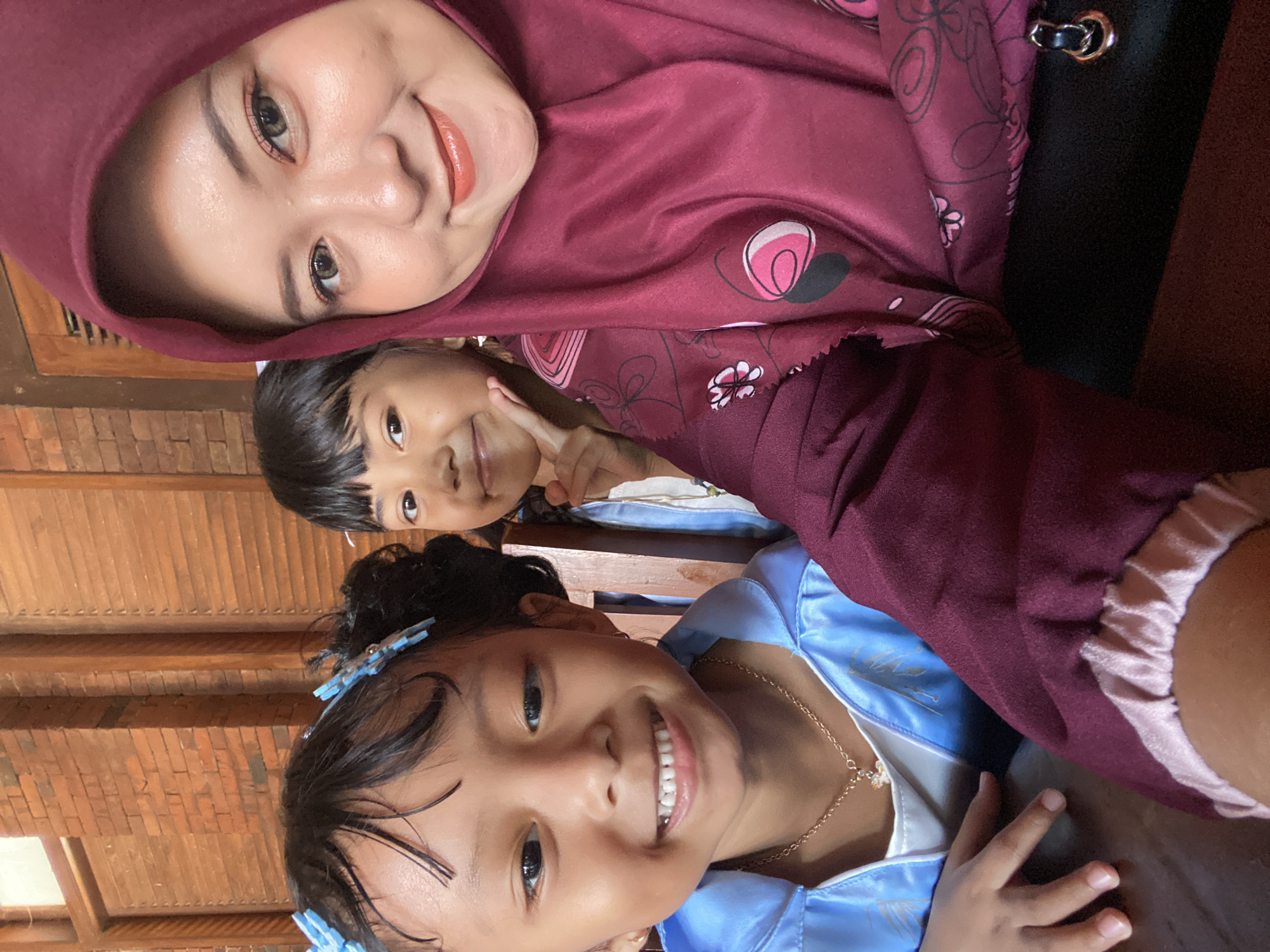 The image is a selfie taken indoors, likely in Kramat, Indonesia. Three people are visible: an adult woman in a maroon hijab, a young girl with a black bob haircut making a peace sign, and another younger girl with dark hair and blue butterfly clips in her hair. The hijab-wearing woman is positioned at the top of the frame. The two girls are positioned in such a way that the one with the butterfly clips is smiling at the bottom of the frame. The younger girl is wearing a gold chain and a blue dress. The selfie is taken in front of a brick wall and wood paneling.