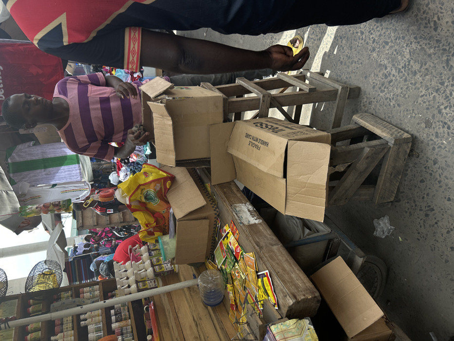 A bustling marketplace scene is captured with an individual in a striped shirt engaging with a cardboard box. Adjacent, wooden pallets and more boxes create a cluttered tableau. A vendor's stall displays various goods including bagged items and smaller merchandise. Overhead, another person in a red and blue top is visible. The overall atmosphere is one of a busy commercial environment.
