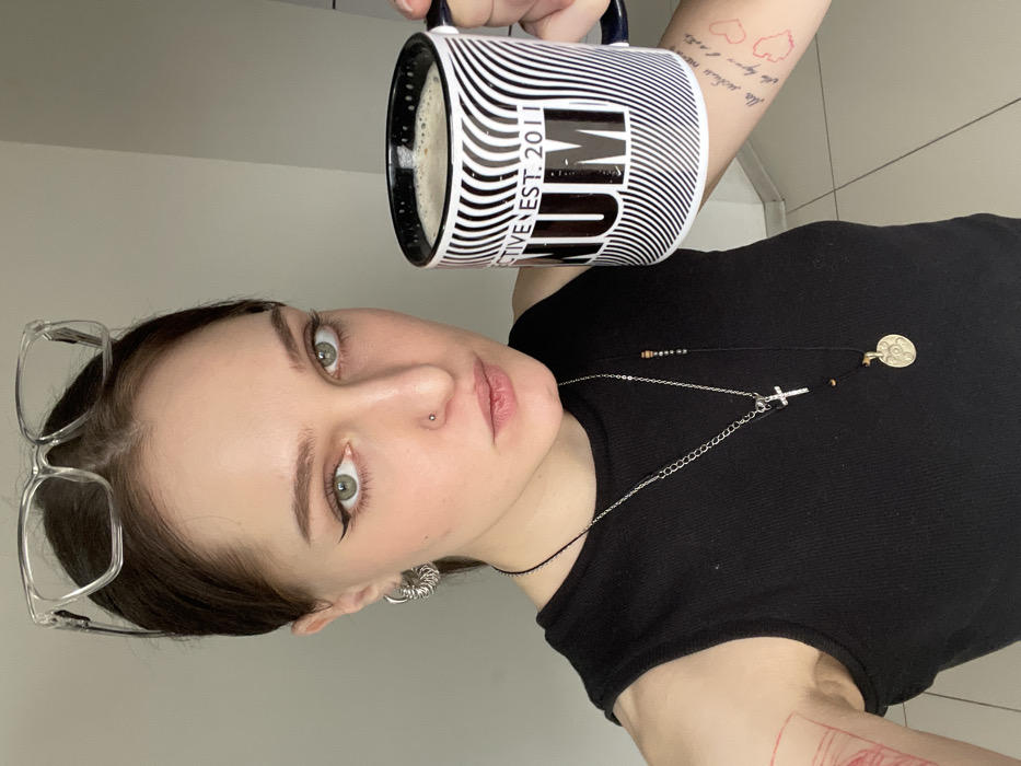 A frontal, medium-close-up indoor portrait of a young adult female, stated to be located in Rostov-on-Don, Russia. The subject has dark hair, light green eyes, and a neutral expression, looking directly at the camera. Clear-framed rectangular glasses rest on top of her head. A small silver stud is present in her left nostril (viewer's right). Her left ear (viewer's left) displays multiple stacked silver hoop earrings. She is wearing a black sleeveless top. Two layered necklaces are visible: a silver chain with a small silver cross pendant, and a black cord with a gold-toned circular pendant featuring a raised design, accompanied by small beads. Faint red line-art tattoos are partially visible on her right forearm (viewer's left). On her left inner forearm (viewer's right), Cyrillic text and two outlined red heart shapes are present. The subject holds a white ceramic mug with a black wavy line pattern and a label reading "ACTIVE EST. 2011 NUM" in her left hand (viewer's right). The mug contains a light brown, frothy beverage. The background consists of a plain, light-colored wall, with a light-tiled floor visible in the lower right.