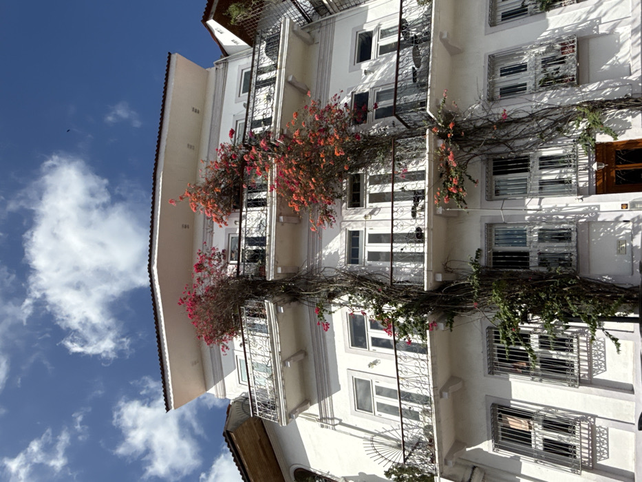 An exterior, low-angle photograph captures a multi-story white building in Panama City, Panama, under a partly cloudy blue sky. The structure features multiple levels of balconies with ornate black wrought-iron railings. Thick, woody vines with clusters of vibrant pink and orange flowers, resembling bougainvillea, climb the facade, spanning from the lower levels up to the top stories and overhanging the balconies. Several balconies on the upper and mid-levels contain small black tables and chairs. The building's windows consist of multi-pane glass, with some on the upper floors appearing as French doors leading to balconies, and lower-level windows secured by white horizontal grilles. A brown tiled roof is visible at the building's apex, with a similar roofline of an adjacent structure visible on the left. A dark, small speck, possibly a bird, is visible in the upper right sky. No individuals are present in the scene.