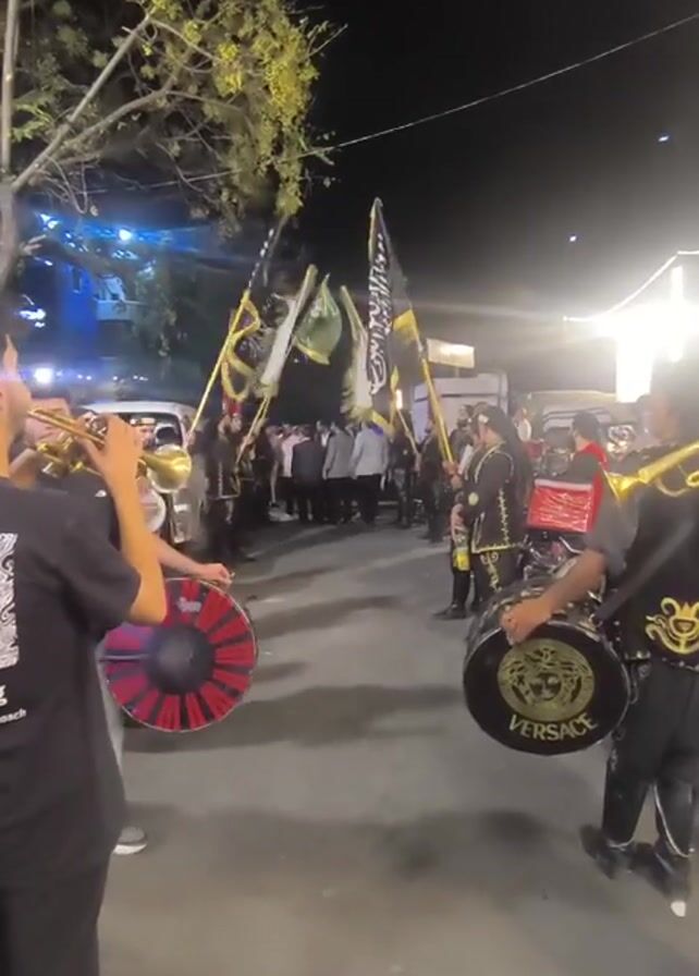 At night, a group of people in dark-colored clothing march down a street with flags while a band plays. The band consists of men playing trumpets and drums with the word “VERSACE” on them. There are people standing on both sides of the street watching the parade. A street light is shining on the side of the street with trees.