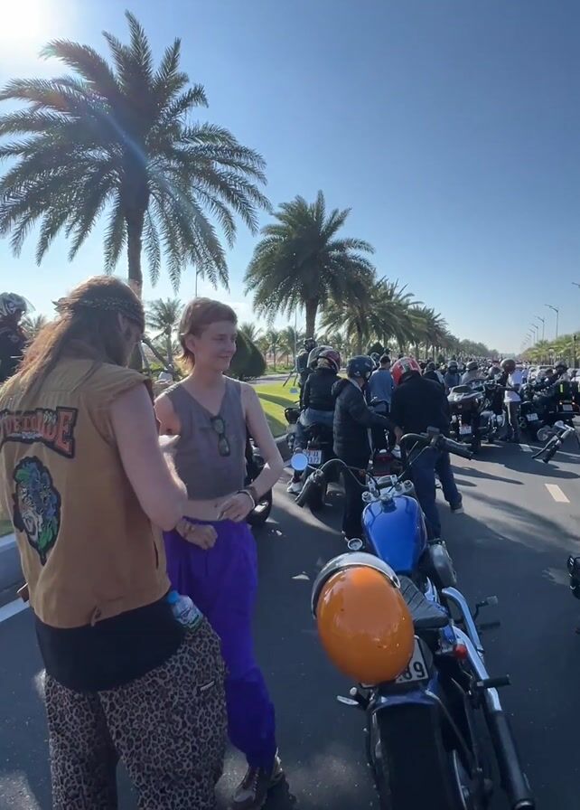 woman and a man standing on a road filled with parked motorcycles. The woman is wearing a gray cropped tank top and purple pants and has short hair. The man has long hair and a beard and is wearing a brown vest over a black top with leopard-print pants. The motorcycles are parked along the road with palm trees lining the sides. Other people are also around, some wearing helmets. The weather appears sunny. The woman is interacting with the man, while the camera pans out to show the line of motorcycles and the surrounding environment.
