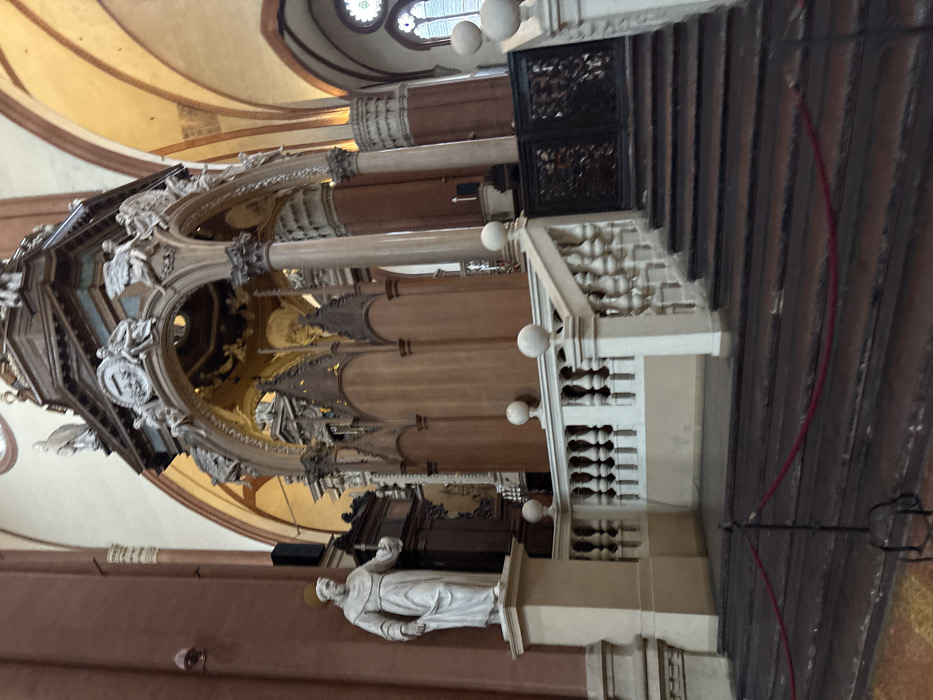 The image displays the interior of the Basilica of San Domenico in Bologna, Italy, focusing on the Arca di San Domenico and its surrounding architectural elements. At the center stands a multi-tiered, ornate marble ciborium or canopy structure. It features multiple columns with fluted shafts and decorative capitals, supporting an upper section adorned with sculpted figures, cherubs, and intricate architectural motifs. Behind the marble structure, a tall, dark wooden cylindrical element with pointed arch-like carvings, possibly gilded in parts, forms the background. To the left, a white marble full-body statue of a male figure, identified as Saint Dominic, stands on a rectangular plinth. The figure wears monastic robes, holds a torch-like object in his raised right hand, and has a faint golden halo around his head. Behind the statue, a dark wooden cabinet is positioned against the reddish-brown wall. In the foreground, a dark-colored stone staircase ascends towards the central structure. A light-colored stone balustrade with spherical finials and numerous balusters lines the right side of the staircase and extends horizontally to the left, connecting with the base of the statue's plinth. A red rope barrier is strung across the lower steps, attached to a dark metal stanchion, restricting access. At the top of the staircase on the right, a dark metal gate with intricate scrollwork patterns is visible. The basilica's interior features warm reddish-brown or terracotta-colored walls with prominent arches and pilasters. The vaulted ceilings are a lighter, possibly cream or yellow hue, accented by darker structural ribs. A circular stained-glass window is partially visible high on the right wall. A dark rectangular speaker is mounted on the upper left wall.