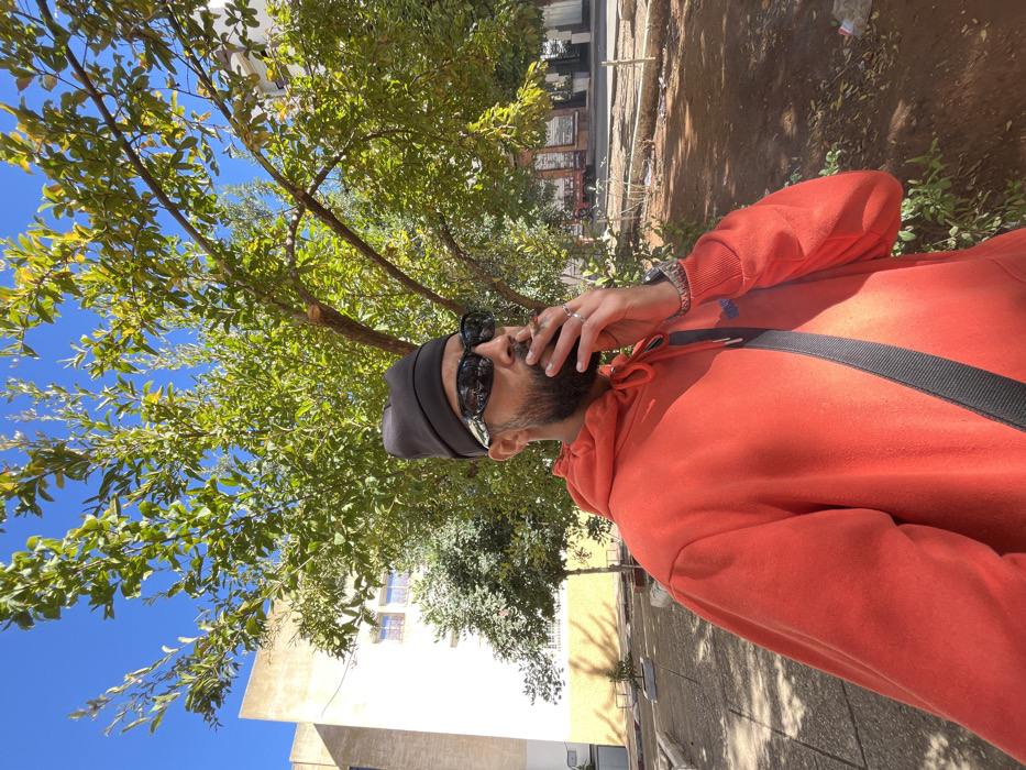 An outdoor, eye-level photograph captured in Meknes, Morocco, features a male subject in the foreground under a clear blue sky. The individual, appearing to be in his 20s or 30s, has a dark beard and is wearing a black beanie, wraparound black sunglasses, an oversized orange hooded sweatshirt, and a dark strap (likely from a bag) across his chest. He wears multiple rings on his left hand and a silver-toned watch on his left wrist. The subject is holding a lit cigarette to his mouth with his left hand, appearing to be smoking. Behind him, a prominent tree with vibrant green foliage dominates the midground. In the background, to the left, a light-colored, multi-story building with windows is visible. To the right, further in the distance, a street or open area contains what appears to be a small red vehicle, possibly a scooter or tricycle, and additional buildings. The scene is brightly lit by direct sunlight, casting shadows on the ground.