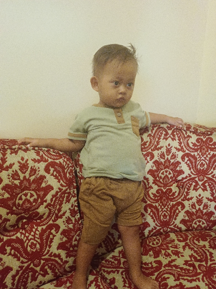 - "A single infant, approximately 1-2 years old, stands centrally on an upholstered sofa in an indoor setting within Kecamatan Pati, Indonesia" by FM-wZIJI3, licensed under CC BY 4.0