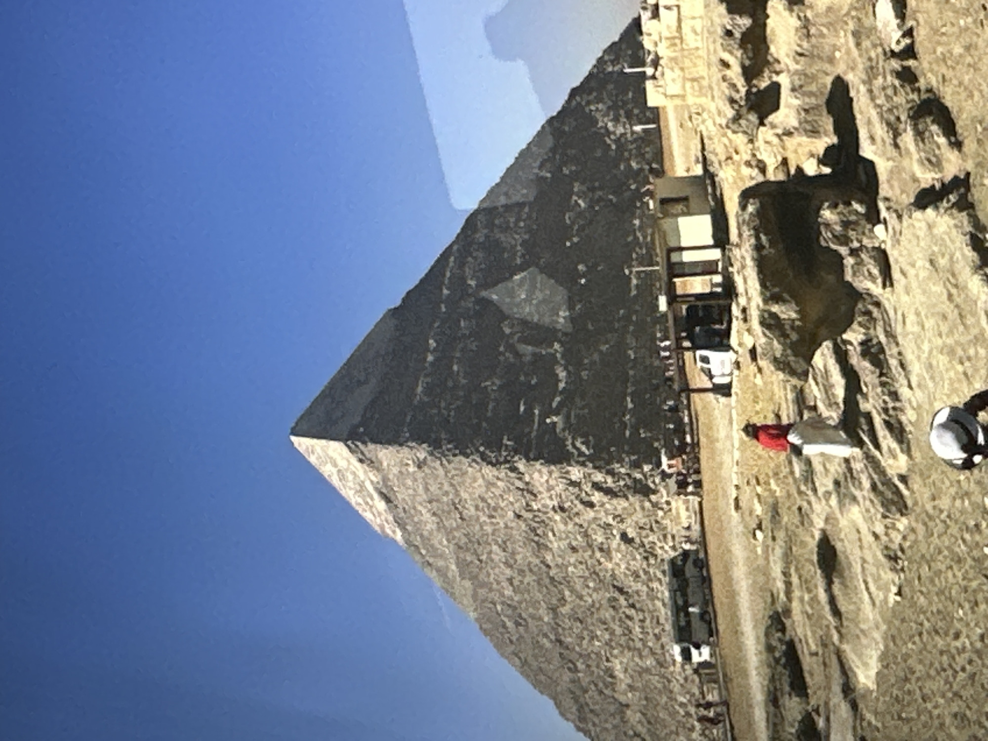 This image depicts a large, ancient-style stone pyramid under a clear blue sky, with the scene located in the city of Targovishte, Bulgaria. The pyramid, constructed from rough-hewn, weathered stone blocks, dominates the upper two-thirds of the frame, culminating in a sharp apex. A faint, smaller triangular reflection or structure is visible on its right face. The foreground and midground consist of arid, rocky, and sandy terrain. In the mid-foreground, an individual wearing a red long-sleeved top and light-colored trousers stands amidst the rocks, partially facing away from the viewer. A person wearing a white hat is partially visible at the bottom center of the frame. Near the base of the pyramid, a small, light-colored building with a dark roof is present, alongside a partially visible white vehicle. Further left, two white passenger buses are parked on a dirt path. Numerous small figures, likely individuals, are discernible near the pyramid's base. Strong sunlight casts distinct shadows across the rugged ground. A rectangular reflection with a partial silhouette overlays the right side of the image, indicating the photograph was taken through a reflective surface such as glass.