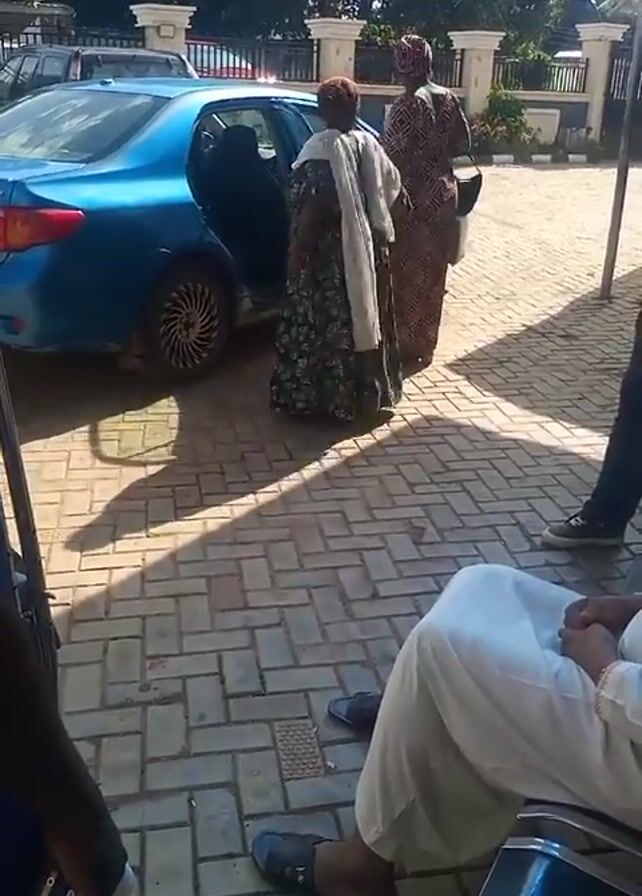 Two women, one wearing a patterned dress and a white shawl, and the other wearing a patterned dress and headwrap, are standing next to a blue car with its door open. The first woman is getting into the car, while the second woman stands beside the open door. A man sits in a chair in the foreground, wearing a white robe and sandals. Another man stands to the side, partially visible, holding a cell phone. The scene takes place on a brick-paved area, possibly a driveway or parking lot. Other cars are visible in the background, along with a building with a gate and some landscaping. The scene is well-lit with natural sunlight, casting shadows across the brick surface.