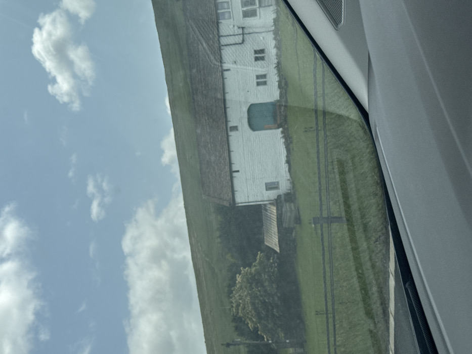 The image is taken from a car driving down a rural road, with a view of a single-story white building with a blue door