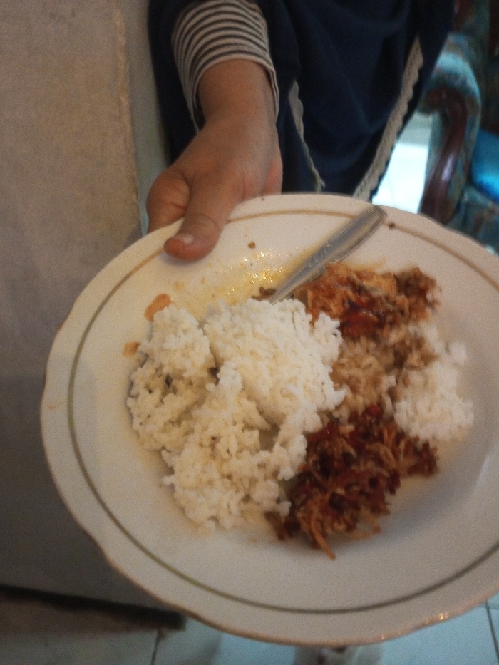 A plate of food is held by a hand. The plate is white with a gold trim and contains a mound of white rice alongside two portions of a red, saucy meat or vegetable dish. A silver spoon rests on the plate. The person holding the plate is wearing a dark blue top with a white and black striped sleeve. The background shows a chair and a glimpse of the room's interior.