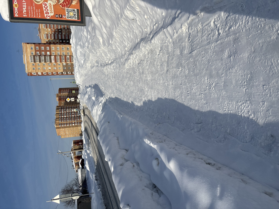 A street scene is depicted in winter with a heavy layer of snow covering the ground and piled up along the sides of the road