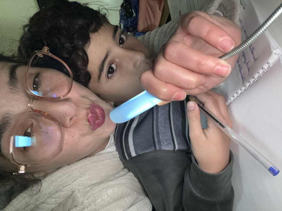 A selfie shows a woman wearing glasses and a child lying close together. The woman makes a duck-lip face, while the child peers into the camera. The child is holding a pen and shining a small blue light, possibly a toy, towards the woman's face. A notebook and a flexible, metal lamp are also visible. The overall image suggests a casual, intimate moment between the pair.
