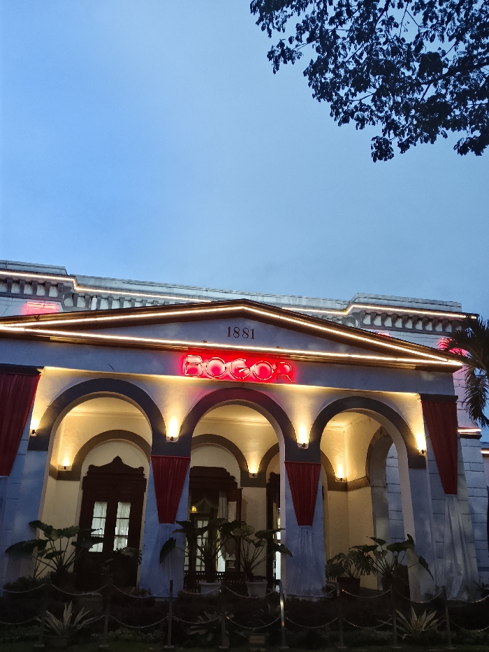The image displays the illuminated facade of a colonial-style building in Bogor, Indonesia, captured during twilight or early evening