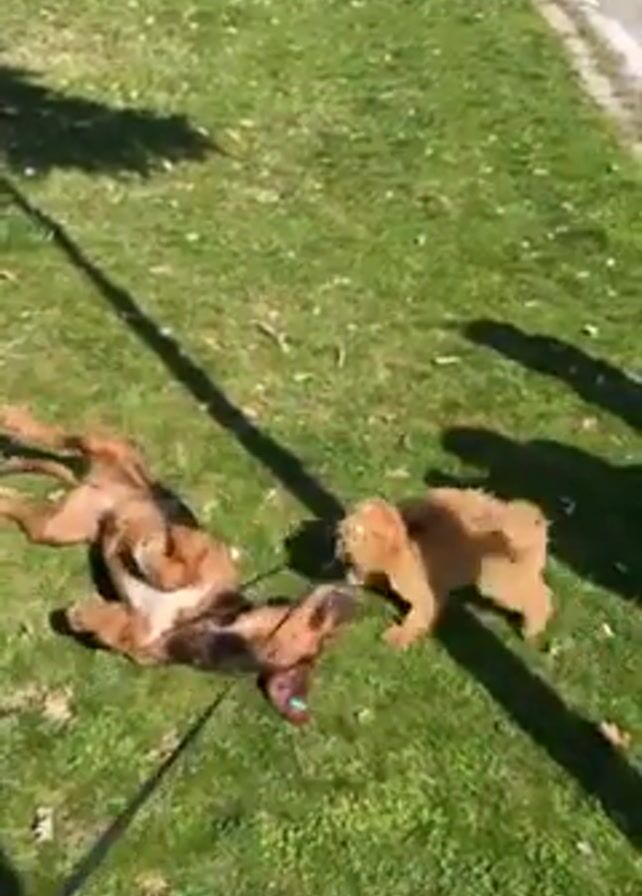 two dogs on a grassy lawn. One dog is lying on its back, wiggling its legs and torso in the air. The other dog is lying on its side near the first dog’s head and appears to be nuzzling or licking it. Both dogs are on leashes, which are attached to a hand holding the leash, just outside the camera frame. The grass is green and there are some shadows from trees. In the background, there is a street with a couple of people and a cyclist.