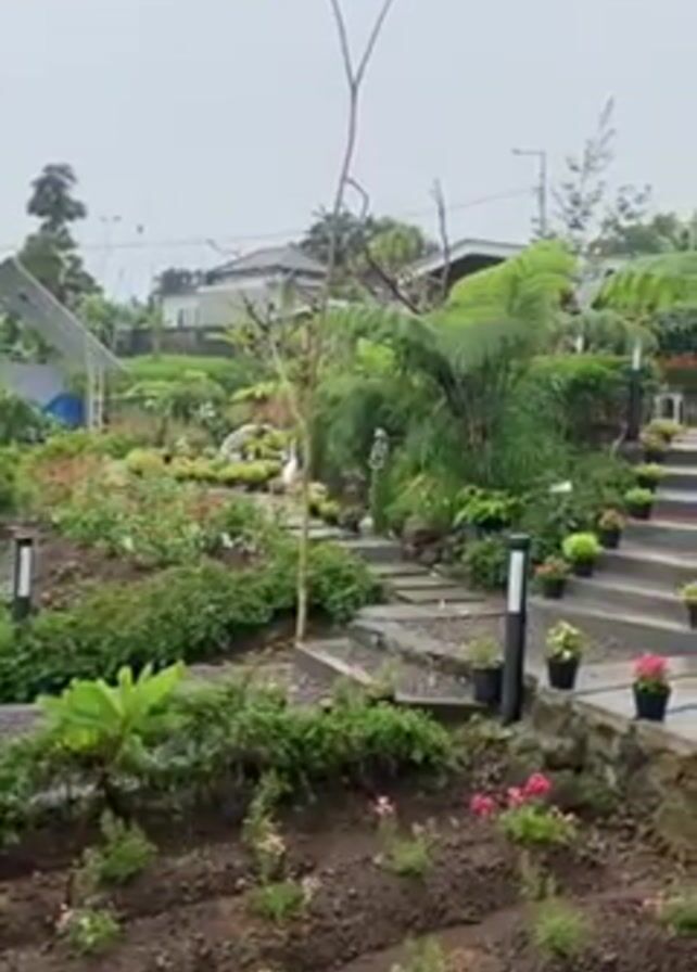 lush garden on a cloudy day. The garden is terraced with flower beds and stone pathways. There are various plants and flowers, including ferns, bushes, and colorful blossoms. A white bird stands amidst the greenery. Small black post lights line the path. In the background, a small white structure with a solar panel roof can be seen, along with a glimpse of nearby houses. The overall scene presents a tranquil and well-maintained garden landscape.