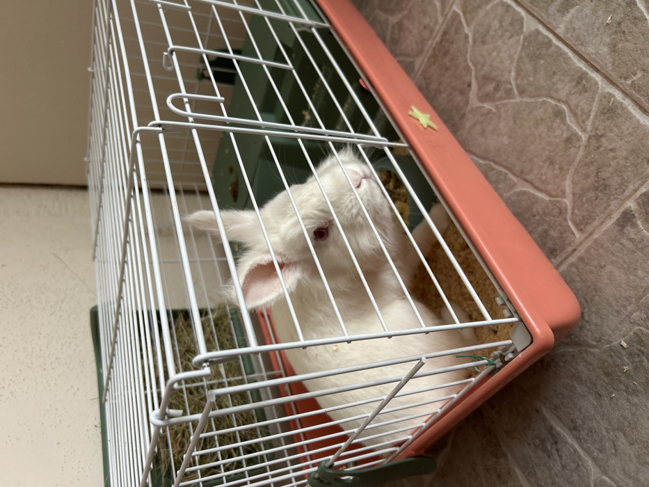 - "A white albino rabbit with red eyes is housed within a rectangular cage, positioned on a tiled floor indoors" by FM-dNBlh2, licensed under CC BY 4.0