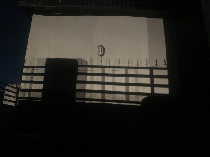 A stark image reveals a building facade under dim light. The upper portion showcases a white wall with a dark, vertical oval symbol. Lower down, sharp shadows resembling a fence pattern stretch across the wall, obscuring a possible entrance. A section of the physical fence is visible on the left side. The foreground is swallowed by darkness, creating a sense of enclosure.
