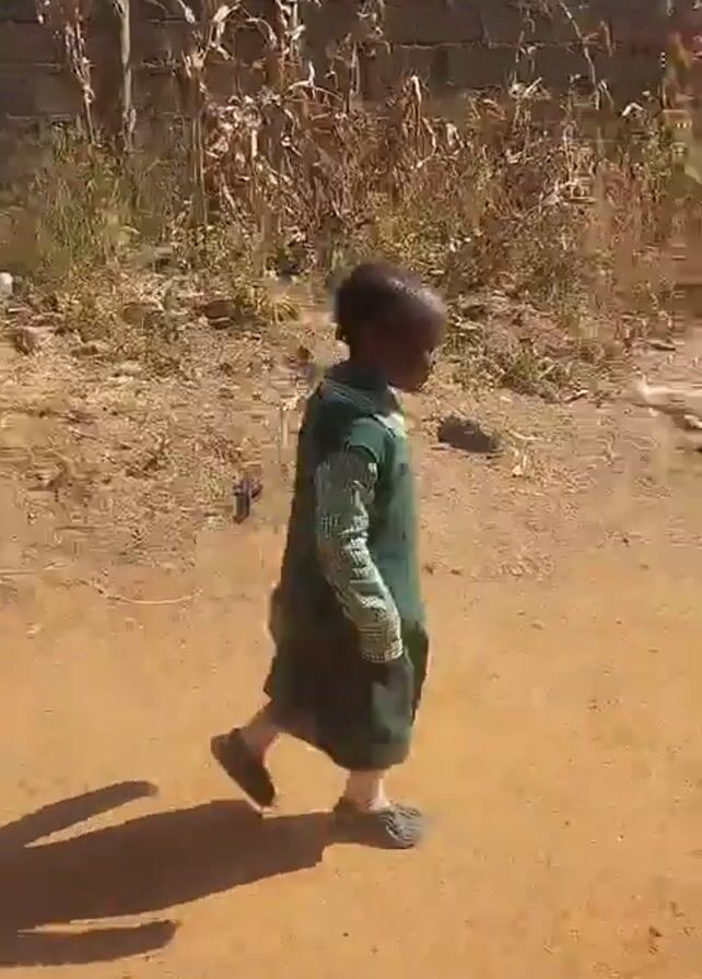 A small child in a green and white school uniform walks along a dirt path. The child's shadow is visible on the ground. The child is walking in the same direction as two adult women. The background includes a brick wall, dry vegetation, and other unidentifiable objects. The lighting indicates it is daytime.