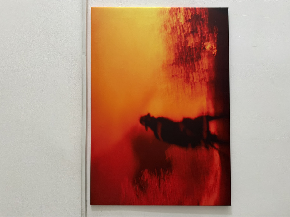 An indoor scene in Sofia, Bulgaria, features a horizontal photographic print mounted on a textured white wall. The print itself depicts a dramatic, abstract composition dominated by red and orange hues, indicative of a fire or intense heat. A dark, silhouetted figure, identifiable as a firefighter by the distinct helmet and gear outline, is positioned in the left-center of the print. The figure exhibits significant motion blur, suggesting movement or activity within the fiery environment. The background on the left is a deep, blurred red, transitioning to a brighter, intense orange and yellow on the right, where abstract, streaked patterns resembling flames or embers are visible. The photograph is suspended from a horizontal, silver-colored picture rail system affixed to the wall above it. The wall surface is consistently white with a slight textural quality, providing a neutral backdrop for the artwork.