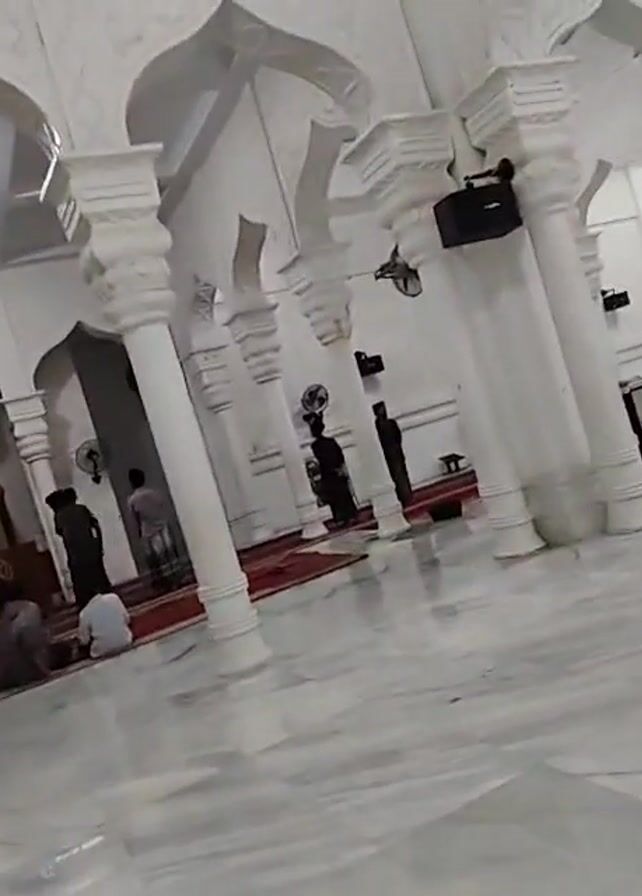interior of a mosque. Several people are present, some kneeling on prayer rugs and others standing. The mosque's interior is characterized by white pillars and arches, a marble floor, and ceiling fans. The audio indicates a religious call to prayer.