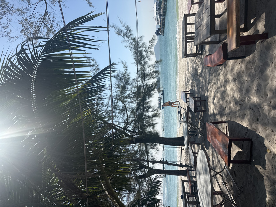A beach scene reveals palm trees and greenery framing the left. Tables and chairs occupy the sandy foreground, casting shadows. In the distance, the ocean meets a bright sky, where a person is seen near the water's edge and a pier structure is visible. The image is shot from a low angle, with sunlight filtering through the leaves.