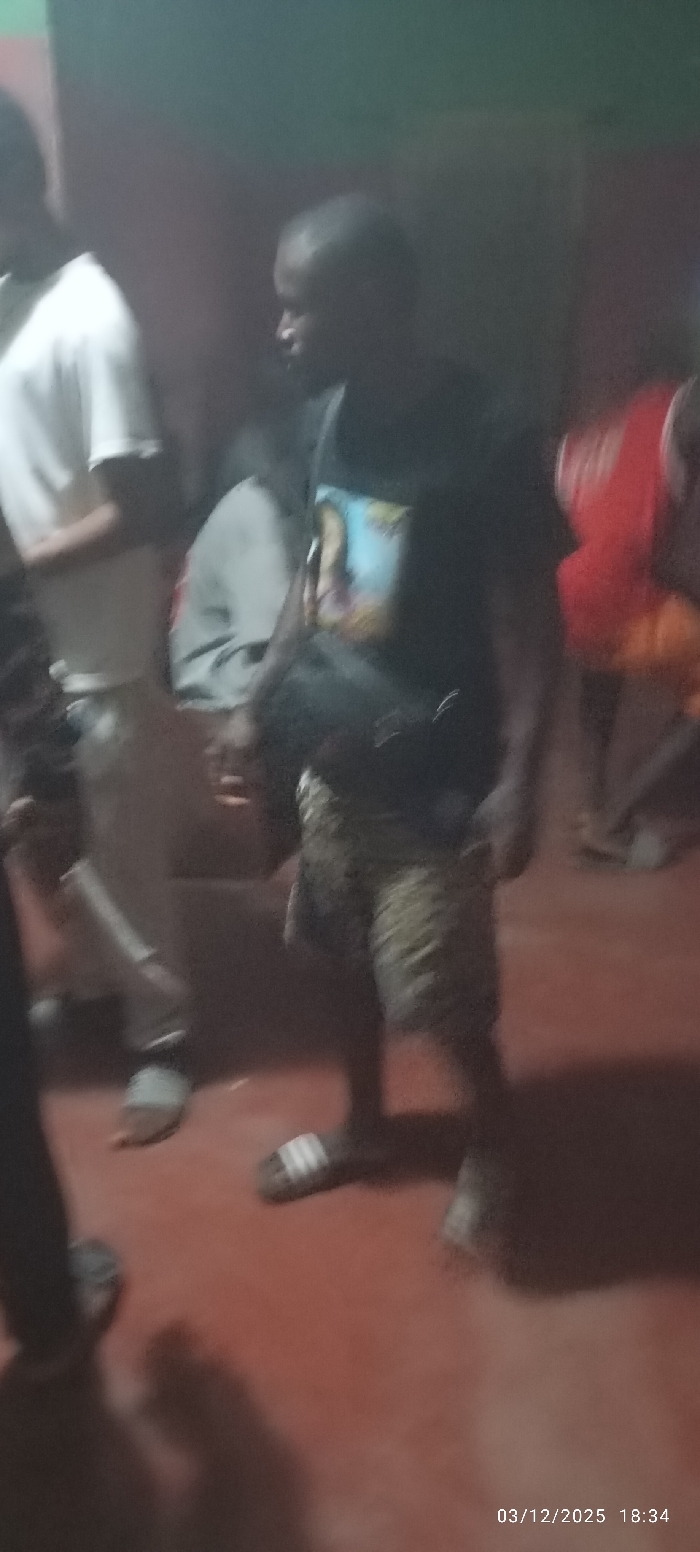A dimly lit indoor scene shows a group of people. A man is in the center, wearing a dark shirt with a graphic, patterned shorts, and sandals. Another person is to his left, wearing a white shirt and light pants. The background is a mix of colors, with what appears to be a red wall or floor. The image is blurry and the date "03/12/2025 18:34" is displayed in the bottom right corner.