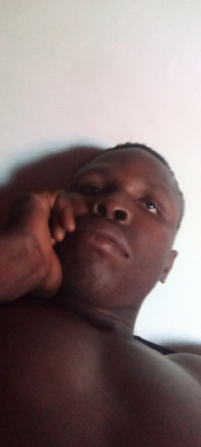 A close-up, angled portrait depicts one individual with dark skin and short, dark hair. The individual's head is positioned towards the upper center of the frame, with their gaze directed upwards and to the right. The left hand is raised, with fingers touching the side of the face near the ear. A portion of the upper torso, appearing bare, is visible in the lower right quadrant. The background is a plain, uniformly light-colored surface. No discernible objects or environmental cues are present to identify a specific location within Sabon Tasha, Nigeria, or any other geographical area. The lighting appears to originate from above or slightly in front, casting subtle shadows.