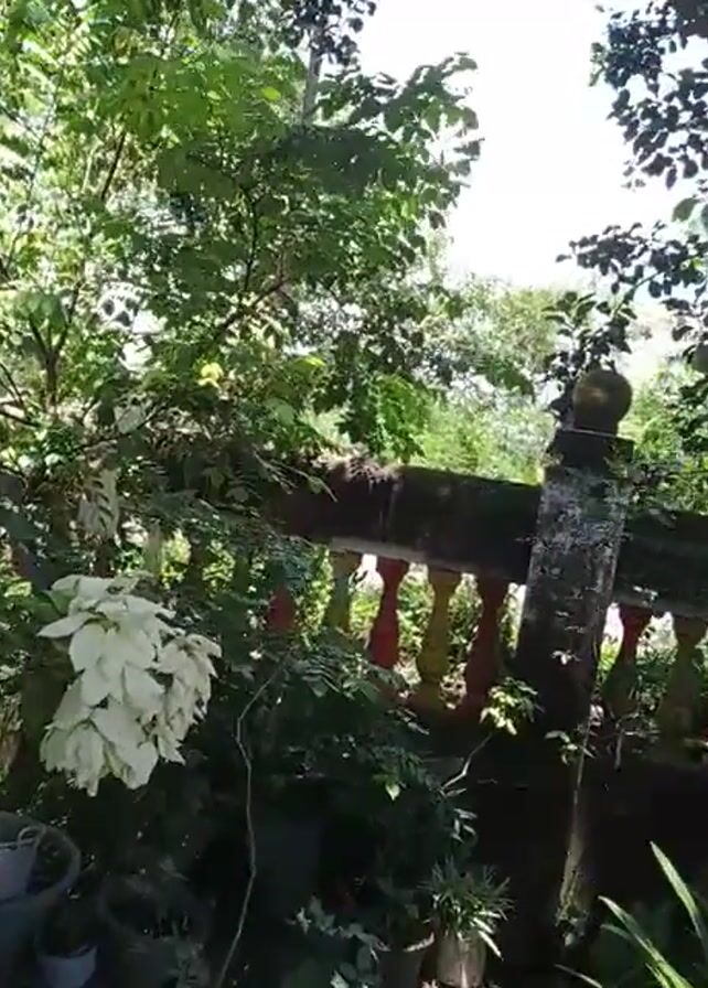 garden. In the foreground, there are white and red flowers, surrounded by green bushes. Behind them, a weathered concrete structure with red and yellow painted details is visible, partly obscured by foliage. The ground is covered with small rocks. The video appears to be taken outdoors on a sunny day, with trees and branches overhead.