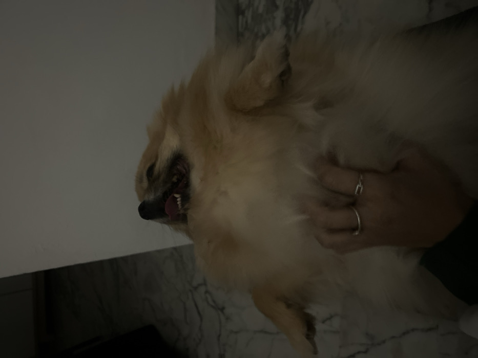 A tan Pomeranian with its mouth open, tongue out, and teeth visible is held by a person's hand. The hand has two rings on its fingers. The dog's fur is fluffy and light-colored. The background includes a white surface and a marble-patterned floor. The lighting in the image is dim, making it difficult to see details.