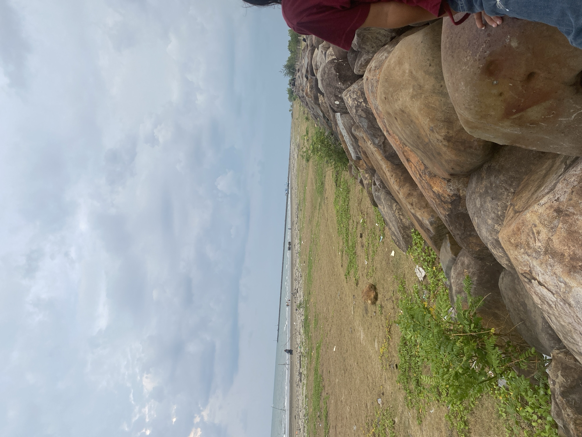 The image depicts a coastal scene in Idi Rayeuk, Indonesia. The upper two-fifths of the frame consist of an overcast sky with dense, light grey clouds. In the immediate foreground on the right, the right shoulder, arm in a dark red short-sleeved top, and a portion of blue jeans of a person are visible, with a hand resting on a large, rounded, light brown rock. This person is positioned alongside a long, irregular barrier constructed from similar large rocks, extending into the midground. To the left of this rock barrier, the ground consists of dry, patchy grass and sand, visibly scattered with various pieces of litter and sparse green vegetation. In the midground, on the sandy beach, a dark figure on a motorcycle is present. Further along the shoreline, several indistinct human figures are visible, and a cluster of dark, large quadrupeds, consistent with cattle or water buffalo, stand on the sand. A long, dark, linear structure, likely a breakwater or pier, extends from the beach into the sea. The background features the sea with light waves, and a faint silhouette of a boat is discernable on the horizon to the left.