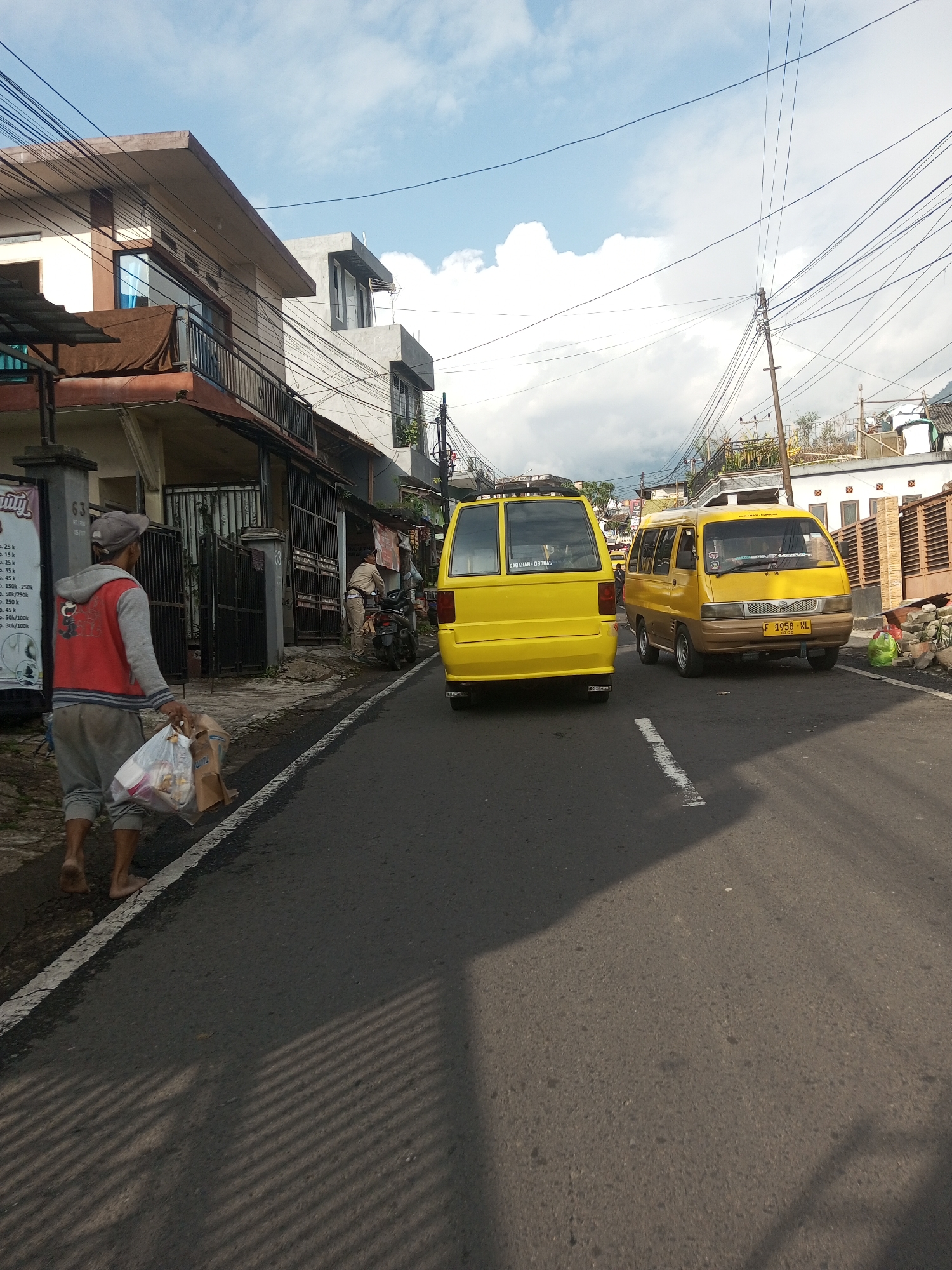 The image depicts a street scene in an urban area, likely in Asia. Two yellow vans, potentially public transportation vehicles, are positioned on the road. The van on the right has a license plate that reads "F 1958 KL" and possibly the words "RARAHAN-CIBODAS" above it. On the left side of the road, a barefoot man carries plastic bags, appearing to be walking away from a building with a sign or poster on the wall. Further along the road on the left, a person seems to be attending to a motorbike near a building. The architecture includes multi-story buildings with balconies. Overhead, electrical wires are prominently displayed. In the background, there is a hint of distant hills or mountains under a partly cloudy sky. The number "63" is visible near a gate or entrance. The location appears to be a residential and commercial area. The street has an asphalt surface, and the overall impression is one of a bustling, populated area.