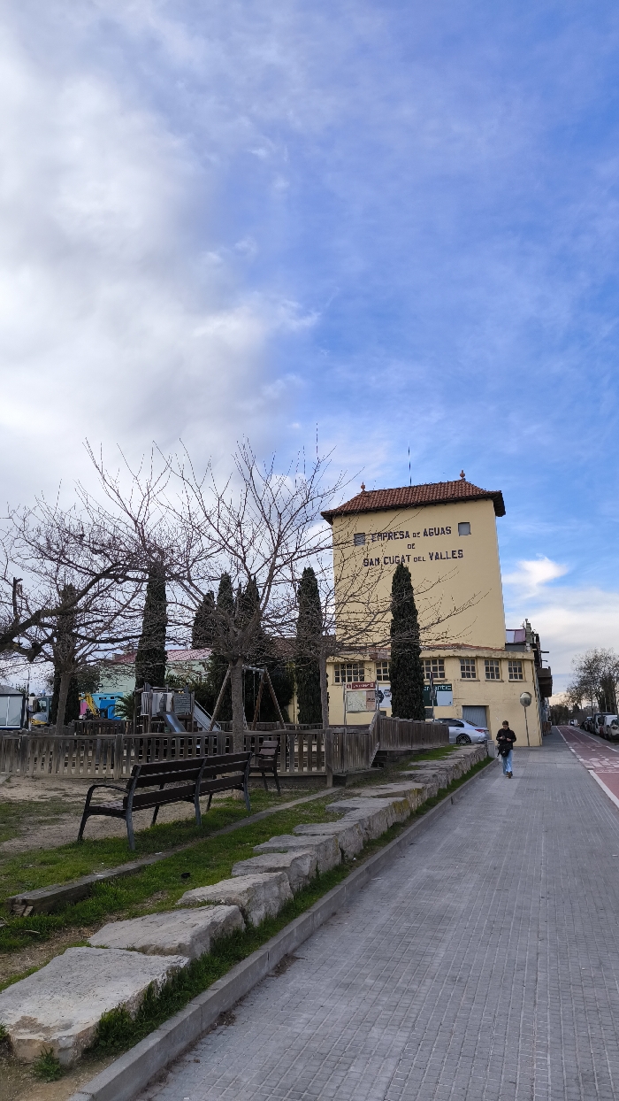A tan, multi-story building with the words "EMPRESA DE AGUAS DE SAN CUGAT DEL VALLES" is seen behind a park with bare trees and benches. A playground is visible in the background. A person walks along a tiled pathway adjacent to a low rock wall separating the park. Cars are parked along the street in the background. The sky above is blue with scattered clouds.