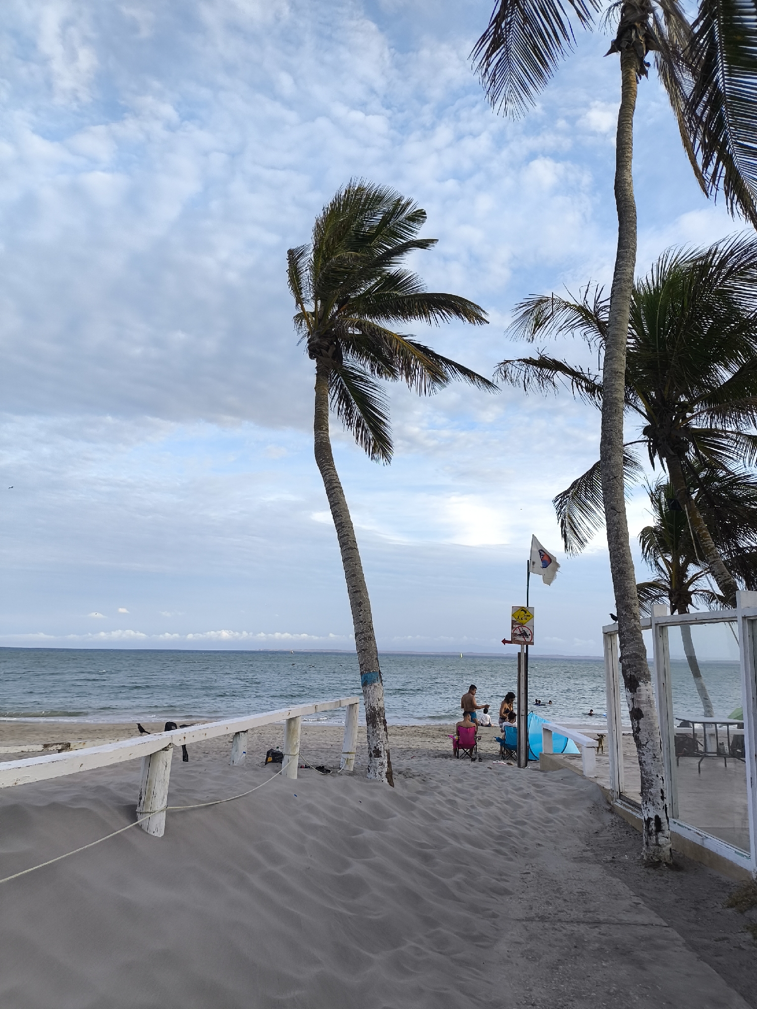The image captures a beach scene in El Yaque, Venezuela. In the foreground, a sandy path leads towards the beach, bordered by a white wooden fence on the left. To the right, tall palm trees frame the scene. In the midground, several people are visible on the beach, some sitting in chairs and others standing near a blue beach umbrella. A signpost with a flag and various symbols stands between the palm trees. In the background, the ocean stretches to the horizon under a cloudy sky.