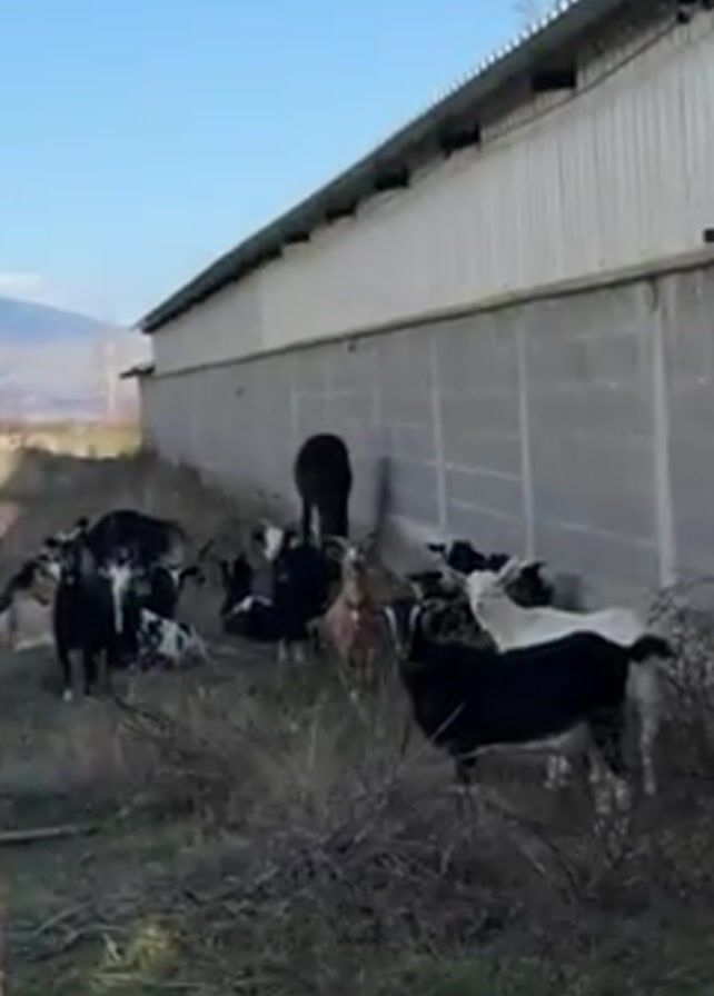 A medium shot shows a herd of goats clustered near a building with a mountain range visible in the distance