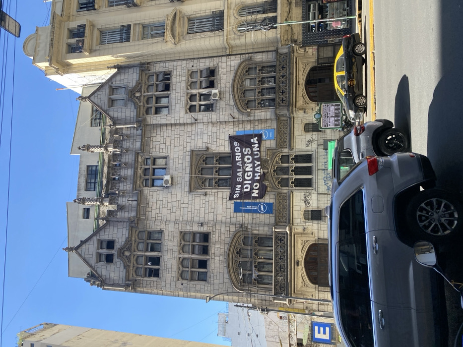 - "A multi-story stone building with ornate window details features a dark banner that reads "SIN SALARIOS DIGNOS NO HAY UNA" and smaller blue banners below" by FM-wG85Y2, licensed under CC BY 4.0