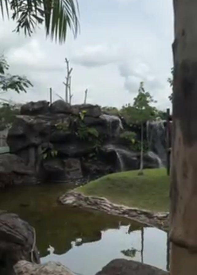 medium shot of a small man-made waterfall in a pond area. The waterfall is built on a rocky outcrop with various plants growing on it. Water cascades down the rocks into a pond below. There is a small grassy island in the pond. The pond is surrounded by rocks and trees, and the sky is cloudy.