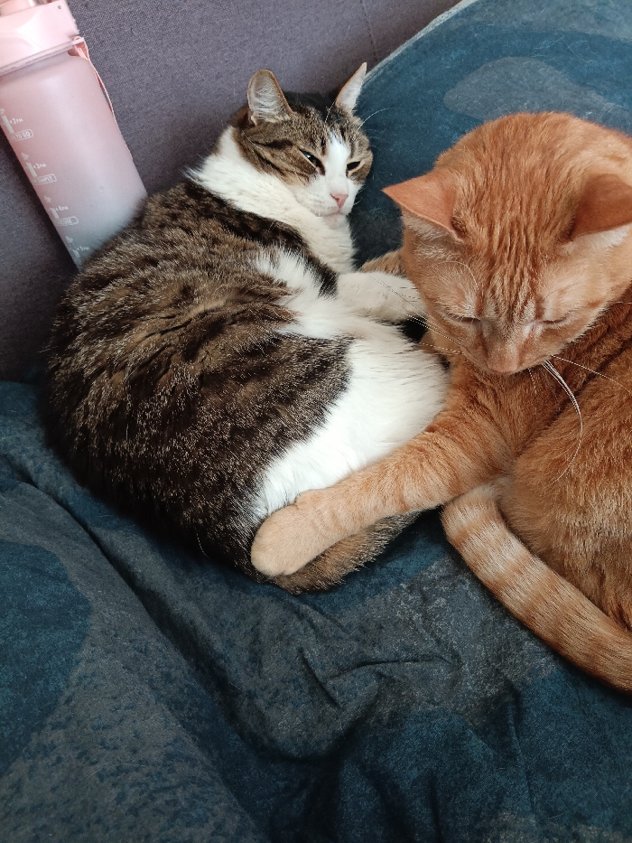 Within a domestic setting in Sevastopol, Ukraine, two felines are observed resting on a blue patterned blanket. A tabby and white cat is positioned on the left, curled into a C-shape, with its eyes partially open, facing right. To its right, an orange cat lies with its head lowered and eyes closed. The orange cat's right front paw rests gently over the midsection of the tabby and white cat. A translucent pink water bottle with time markings is visible on a grey upholstered surface behind the tabby and white cat.