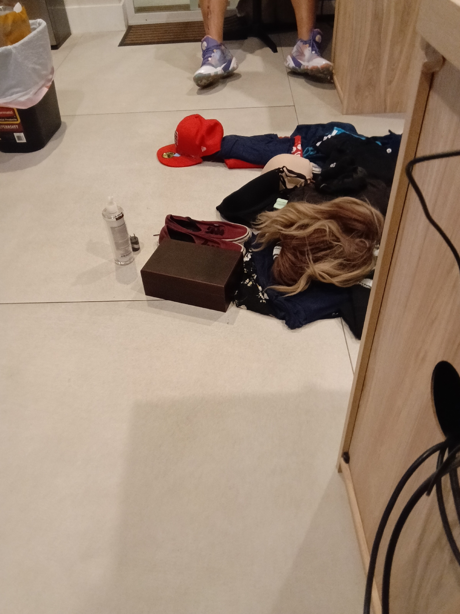 A high-angle indoor shot reveals a tiled floor cluttered with various objects. In the upper left is a black trash can with a gray liner. A red baseball cap rests on the floor, beside a pile of dark clothing. A brown cardboard box and a bottle of clear liquid are positioned nearby. Partially obscured by the clothing is a tan-colored object resembling a wig. In the background, two people are standing, both wearing light-colored athletic shoes. A wooden cabinet edge is visible on the right. The location is indoors, but there is no additional information provided to confirm that it is in Los Angeles, United States of America.