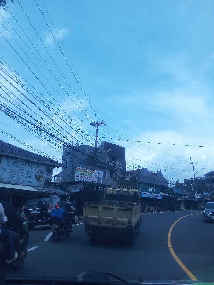 This image depicts a bustling street scene in the city of Chori, Nigeria, under a bright blue sky with scattered white clouds. A dense network of black utility wires spans across the upper portion of the frame. The foreground shows an asphalt road curving to the right, marked by a yellow dividing line. Vehicles are actively navigating the street. In the left foreground, the rear of a dark-colored SUV or minivan is partially visible, with a person on a black motorcycle, wearing a dark jacket and helmet, carrying a blue package on the rear, positioned behind it. Further right, a yellow, open-back dump truck with a visible rear license plate is driving away from the viewer. Another dark-colored vehicle is visible further down the road on the right curve. Along both sides of the street, commercial buildings line the thoroughfare. On the left, a building features a large white sign with text in the Indonesian language, including "WARUNG PEAYEM CAKRA." Below it, an awning extends over a visible parked vehicle. Adjacent to this, another building displays a sign with Indonesian text such as "RENTAL MOBIL DAN MOTOR" (Car and Motorcycle Rental) and "MODERN WARGA." Utility poles with multiple cross arms support the overhead wiring at various points along the street. On the right side of the street, a building prominently displays a blue sign with the brand name "OPPO" in white lettering. The architectural styles of the visible structures suggest an urban commercial environment, with details consistent with Southeast Asian design elements. The overall scene indicates active daily commerce and traffic.