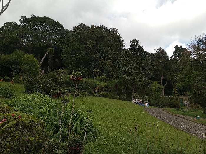 A grassy slope ascends towards a dense forest under a cloudy sky. Various plants and shrubs fill the foreground, while a cobbled path runs alongside the slope. A small group of people is situated further up the slope, seemingly enjoying the scenery. The trees are verdant and create a thick canopy. Overall, the image captures a serene park-like landscape with both cultivated and natural elements.