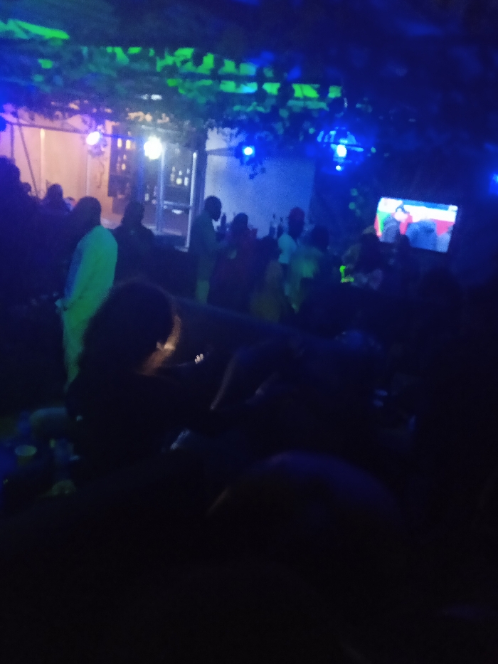 The dimly lit interior suggests a nightclub or bar. A crowd of people is visible, with some standing near the bar area. A television screen displays content on the right. Lighting features include blue spotlights and green foliage-like decorations hanging from the ceiling. The overall atmosphere appears to be social and lively, possibly indicating a nighttime event or gathering.