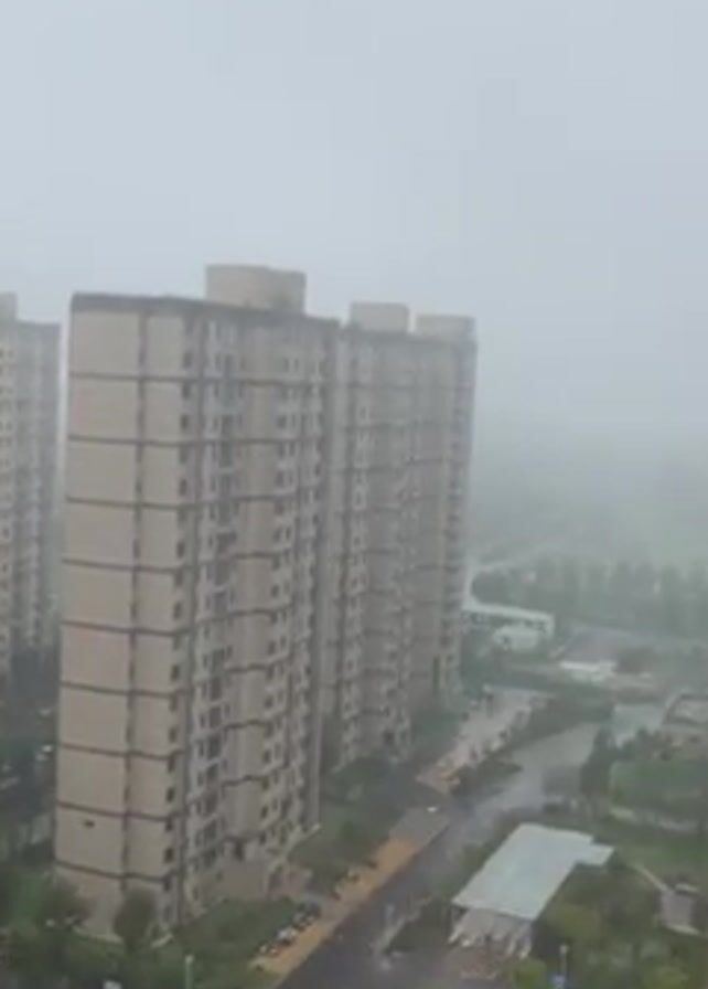 The video depicts a cityscape under heavy rain, partially obscured by fog