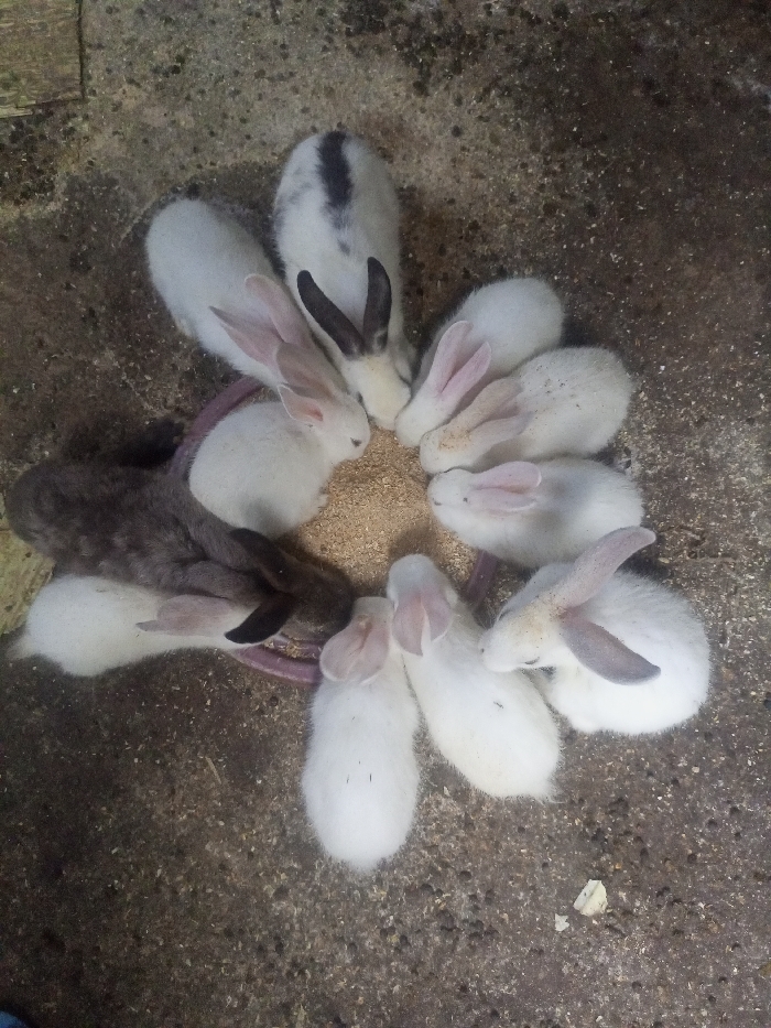 - "A cluster of rabbits surrounds a bowl of feed" by FM-4V0Yx1, licensed under CC BY 4.0