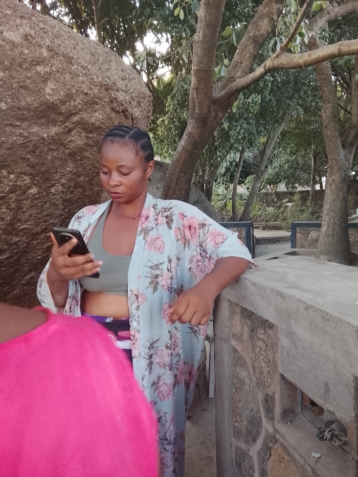 An adult female, likely in her late twenties to early thirties, is depicted in an outdoor setting in Jos, Nigeria. She has dark braided hair pulled back from her face and is looking down at a black smartphone held in her left hand. She is wearing a light blue open kimono with a pink floral pattern over a light green ribbed crop top, revealing her midriff, and partially visible patterned shorts or trousers. Her right arm rests on a low, concrete and stone-faced wall or barrier. To the immediate left of the female subject, a portion of another individual, visible only by a bright pink garment, is present in the foreground. The background features a large, light brown natural rock formation on the left. Numerous trees with visible trunks, branches, and green foliage are scattered throughout the midground and background, suggesting a park-like or natural landscape. Further back, additional stone and concrete structures, including low walls, are visible amidst the greenery. The lighting indicates daylight, possibly late afternoon, with soft, directional illumination.
